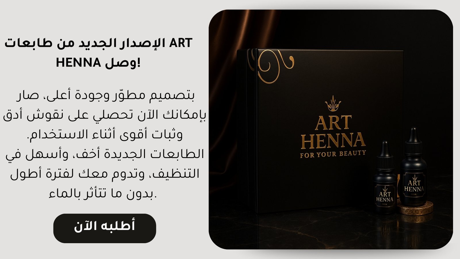 ART Henna رسم يدوم وتألق لا يضاهى ابدئي جمالك الآن Previous slide Next slide الإصدار الجديد من طابعات ART HENNA وصل!بتصميم مطوّر وجودة أعلى، صار بإمكانك الآن تحصلي على نقوش أدق وثبات أقوى أثناء الاستخدام. الطابعات الجديدة أخف، وأسهل في التنظيف، وتدوم معك لفترة أطول بدون ما تتأثر بالماء. أطلبه الآن عروض حصرية لا تفوتهاجربيه اليوم وتألقي بنقش فريد تسوق الآن المنتجات الأكثر طلبا إضافة إلى السلة بكاج طابعات الحناء 2025 ر.س249.00 تم التقييم 0 من 5 إضافة إلى السلة حناء أسود ملكي 60مل ر.س89.00 تم التقييم 0 من 5 غير متوفر في المخزون قراءة المزيد طابعات الحنه الأصلية ر.س150.00 تم التقييم 0 من 5 إضافة إلى السلة حناء أصلي 50مل ر.س80.00 تم التقييم 0 من 5 عرض محدود إصدار جديدجربوا أحدث نقوشنا مع إصدار خاص لمحبات الفن والجمال لا تفوّت الفرصة Previous slide Next slide Previous slide Next slide ART HENNA – نوفر لكِ طابعات حناء عالية الجودة، سهلة الاستخدام، ومقاومة للماء، لتمنحكِ نقوشاً ساحرة في ثوانٍ! ✨ سحرُ الحناء بين يديك " الإصدار الجديد" الشركة الأولى الرائدة في عالم طابعات الحنه